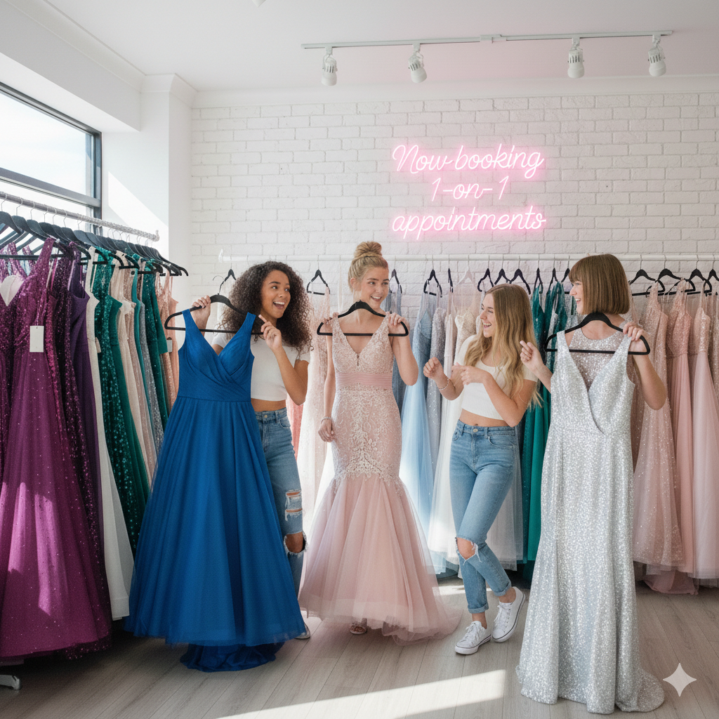 During Feb - April we will hold try-on events which are by appointment only with our volunteer stylists. You’ll have one hour to browse our collection of 1000+ dresses and try them on.